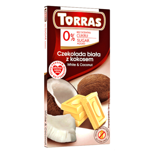 Wysokiej jakości czekolada biała z kokosem Torras bez dodatku cukru wyprodukowana w Hiszpanii, będąca doskonałym wyborem dla osób, które unikają cukru oraz glutenu w diecie, a nie chcą rezygnować z ulubionych słodyczy. Połączenie oryginalnej białej czekolady z wiórkami kokosowymi tworzy słodką i aromatyczną kompozycję.